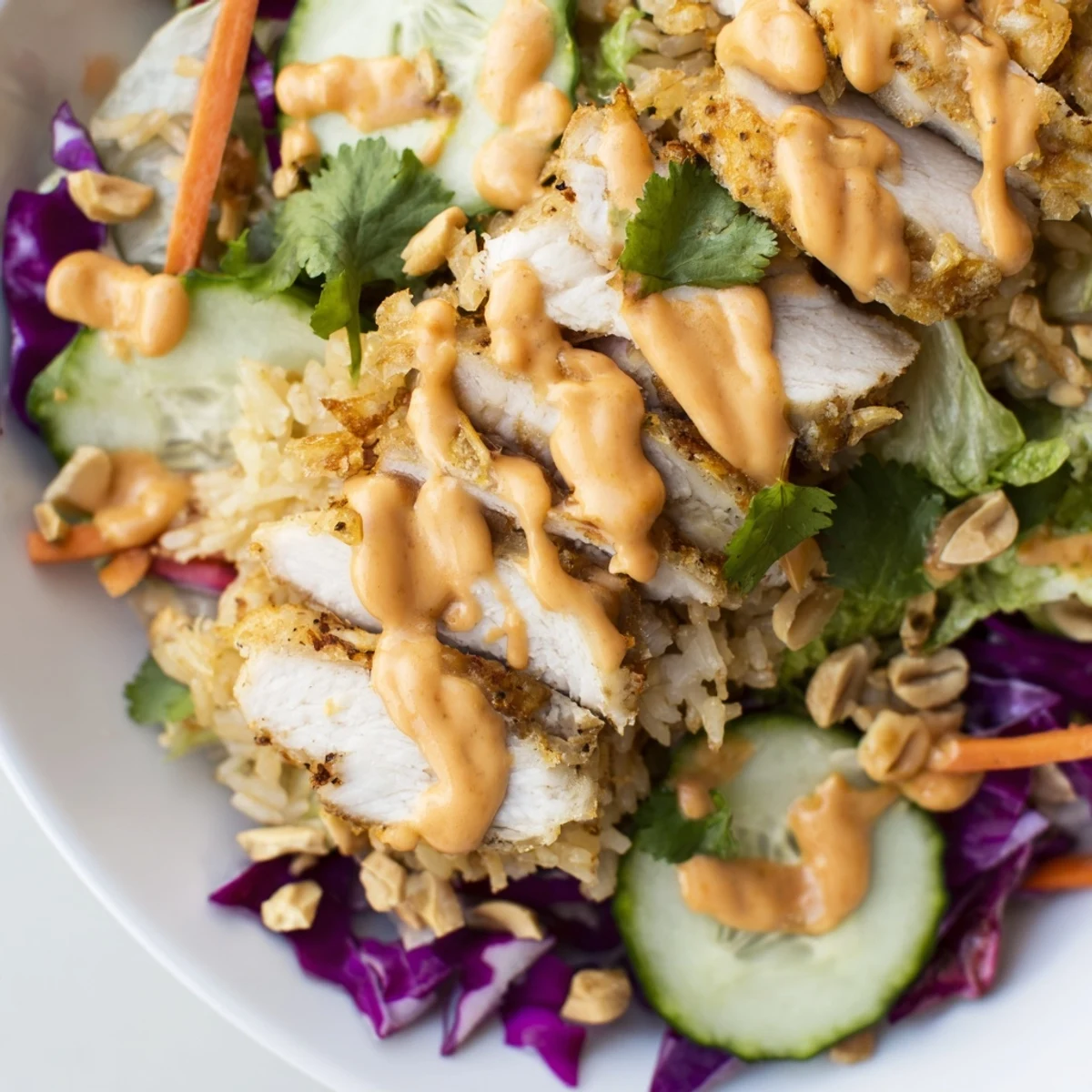 - Scatter the crispy rice over the vegetables, then arrange sliced chicken on top. Drizzle that Bang Bang sauce generously—I mean it, dont be shy. Finish with chopped peanuts and sesame seeds.