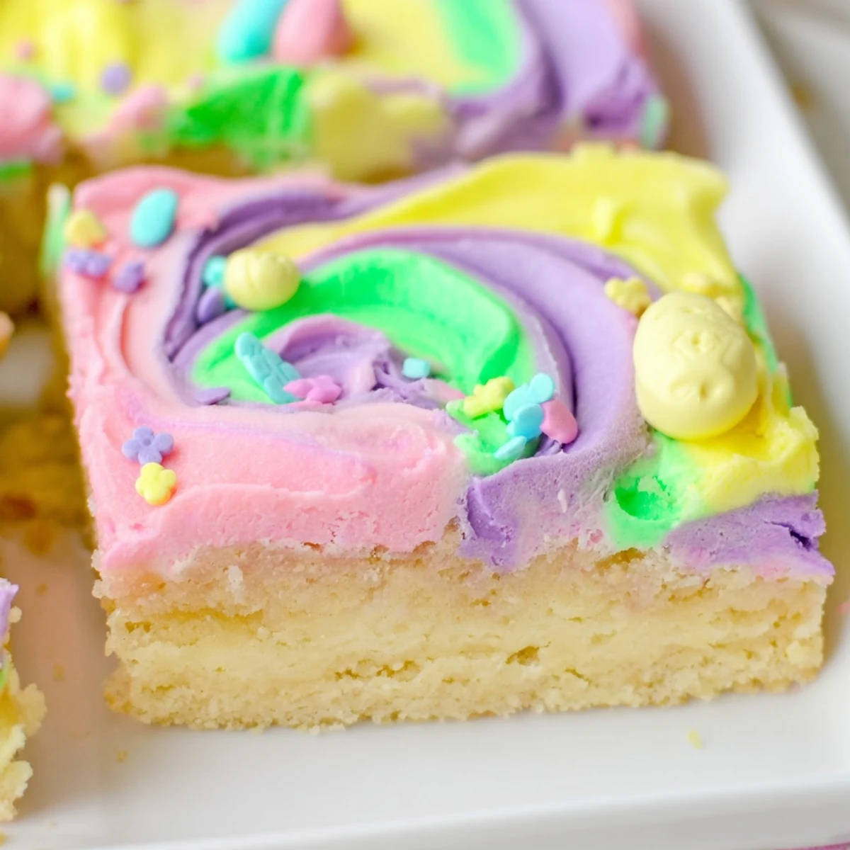 - Scatter Easter sprinkles over the frosting while it is still soft, then lift the bars out and cut into squares
