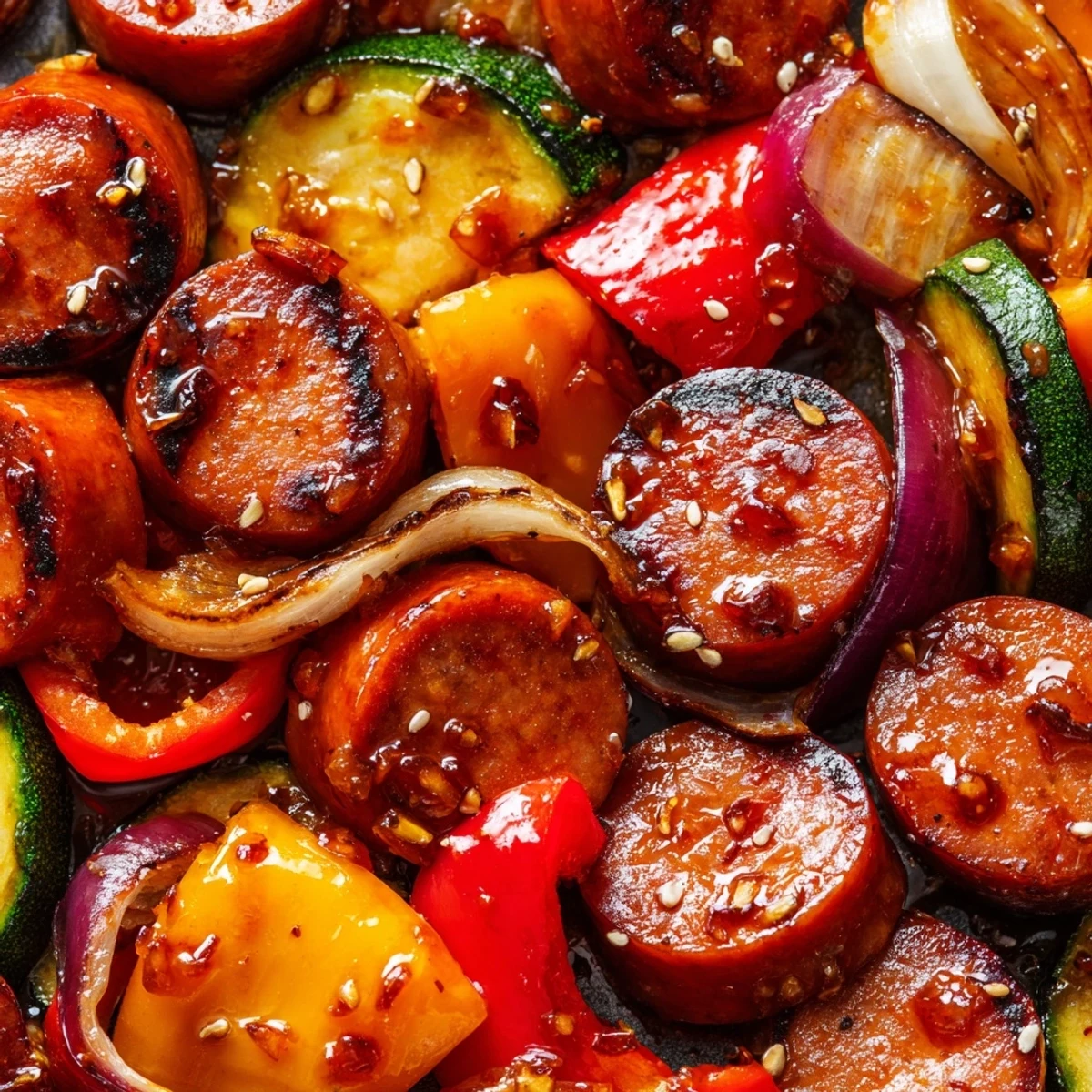 This hearty skillet combines sliced kielbasa with colorful bell peppers, zucchini, red onion, and baby carrots, all coated in a sweet and tangy honey garlic glaze. The smoky sausage pairs perfectly with tender crisp vegetables, while the sauce adds just the right balance of sweetness and savory depth.