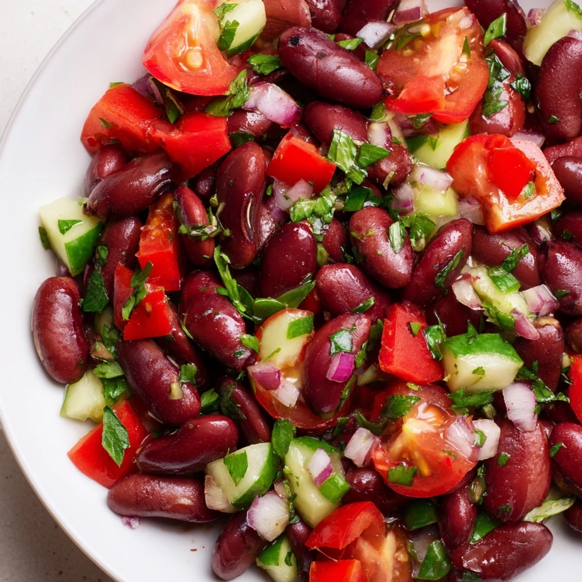 This refreshing kidney bean salad combines protein-rich legumes with crisp red onion, bell pepper, cucumber, and cherry tomatoes. The tangy vinaigrette dressing ties everything together beautifully. Ready in just 15 minutes with no cooking required, it's perfect for meal prep, summer gatherings, or quick weekday lunches. Chill for 30 minutes before serving to let flavors meld together.