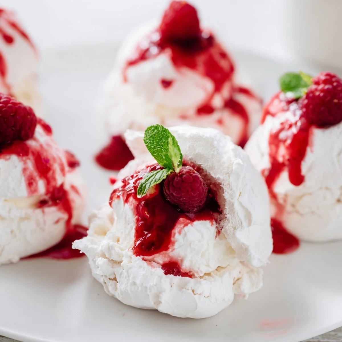 These delicate meringue bombs feature crisp outer shells giving way to soft, marshmallow centers. Each shell gets filled with lightly sweetened whipped cream, then finished with a vibrant raspberry coulis that balances sweetness with bright tang. The contrast of textures—crisp meringue, airy cream, and smooth fruit sauce—creates an elegant dessert perfect for entertaining.