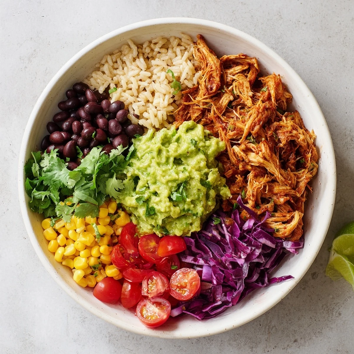 This satisfying bowl combines tender, spice-rubbed pulled chicken with vibrant Tex-Mex flavors. The chicken simmers in aromatic spices until perfectly shreddable, while fresh guacamole adds creaminess and brightness. Build your bowl with brown rice, black beans, sweet corn, cherry tomatoes, and crisp cabbage for a complete, nutritious meal that's naturally gluten-free and ready in under an hour.