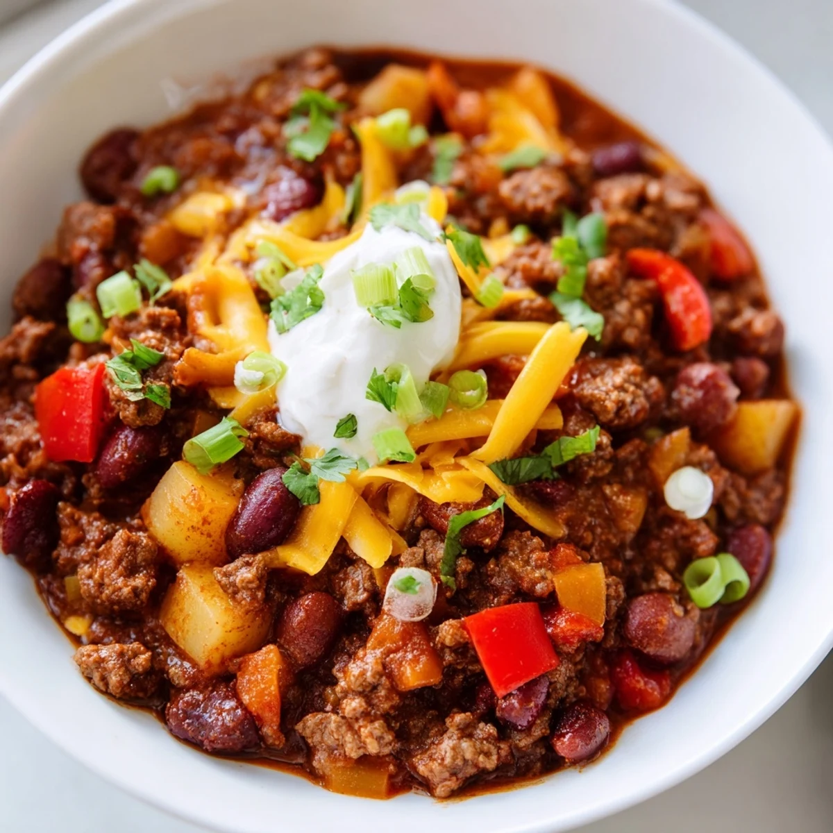 This bold chili blends two types of tender beef with kidney, black, and pinto beans, simmered in a spicy tomato base enhanced by chili powder, cumin, smoked paprika, and chipotle. After hours of gentle cooking, it's topped with sharp cheddar, sour cream, scallions, and fresh cilantro for depth and creaminess. The harmonious heat and rich textures make this dish a warming, satisfying choice for any meal.